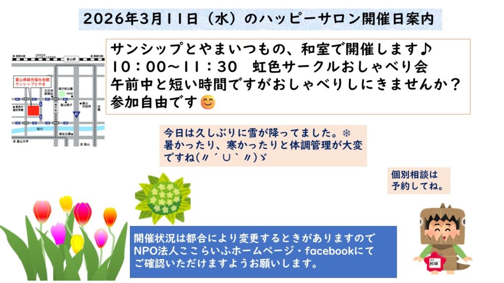 こんにちは♪3月11日(水)サンシップとやまでハッピーサロン開催します♪ 作成者 coco公開日 2026年3月8日こんにちは♪3月11日(水)サンシップとやまでハッピーサロン開催します♪ にコメントを残す 気軽に参加してね