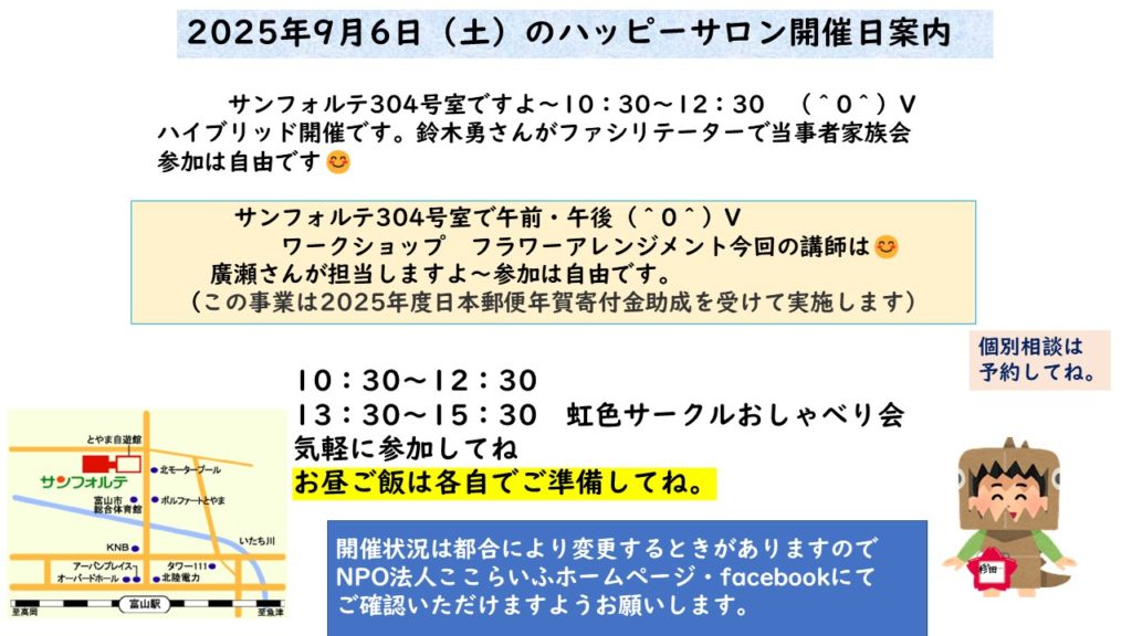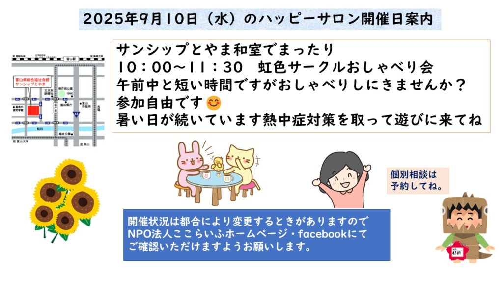 9月10日(水)サンシップとやま和室でハッピーサロン開催日ですよ~(^0^) 作成者 coco公開日 2025年9月8日9月10日(水)サンシップとやま和室でハッピーサロン開催日ですよ~(^0^) にコメントを残す 気軽に参加してね