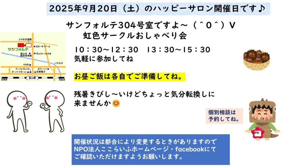 9月20日(土)ハッピーサロン開催日ですよ~(^0^) 作成者 coco公開日 2025年9月17日9月20日(土)ハッピーサロン開催日ですよ~(^0^) にコメントを残す 残暑きびし~いけどちょっと気分転換しに来ませんか😊