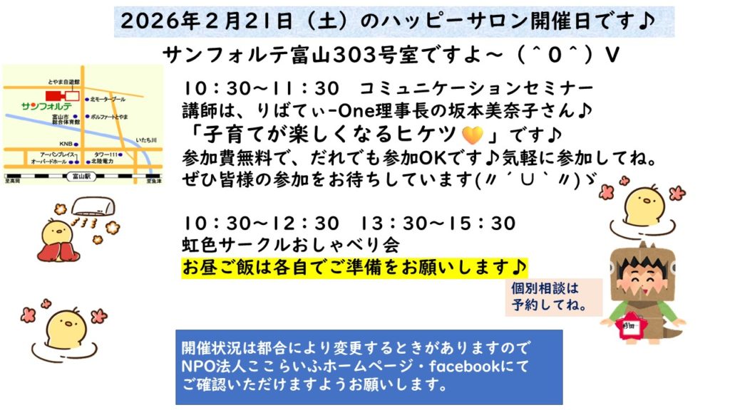 2月21日土曜日ハッピーサロン開催します。りばてぃ-one坂本美奈子さんのコミュニケーションセミナー開催です♪ 作成者 coco公開日 2026年2月14日2026年2月14日2月21日土曜日ハッピーサロン開催します。りばてぃ-one坂本美奈子さんのコミュニケーションセミナー開催です♪ にコメントを残す 参加費無料です。「子育てが楽しくなるヒケツ」と題してお話していただきます。気軽に参加してね