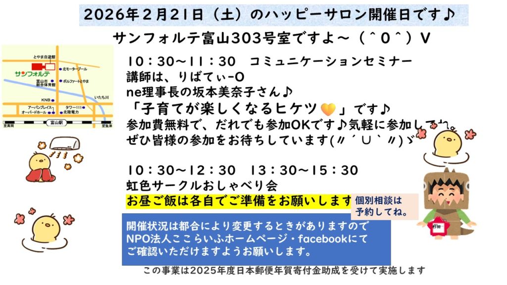 参加費無料です。「子育てが楽しくなるヒケツ」と題してお話していただきます。気軽に参加してね